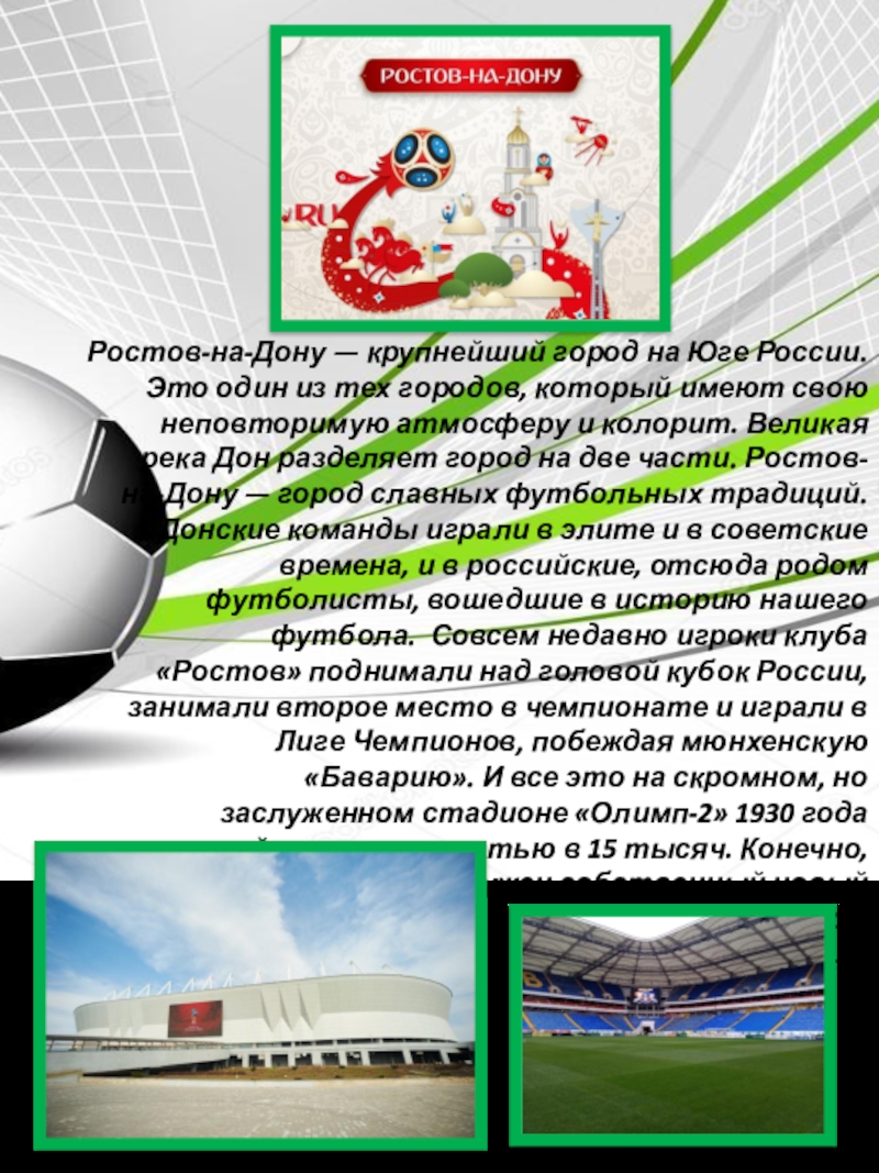 городов, который имеют свою неповторимую атмосферу и колорит. Великая река Дон разделяет город на две части. Ростов-на-Дону — город славных футбольных традиций. Донские команды играли в элите и в советские времена, и в российские, отсюда родом футболисты, вошедшие в историю нашего футбола. Совсем недавно игроки клуба «Ростов» поднимали над головой кубок России, занимали второе место в чемпионате и играли в Лиге Чемпионов, побеждая мюнхенскую «Баварию». И все это на скромном, но заслуженном стадионе «Олимп-2» 1930 года постройки, вместимостью в 15 тысяч. Конечно, такой команде был нужен собственный новый стадион на Левом