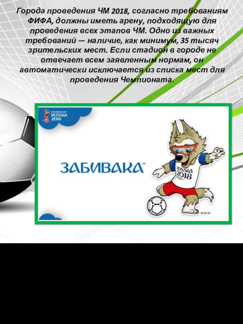 Слайд 2Города проведения ЧМ 2018, согласно требованиям ФИФА, должны иметь арену, подходящую