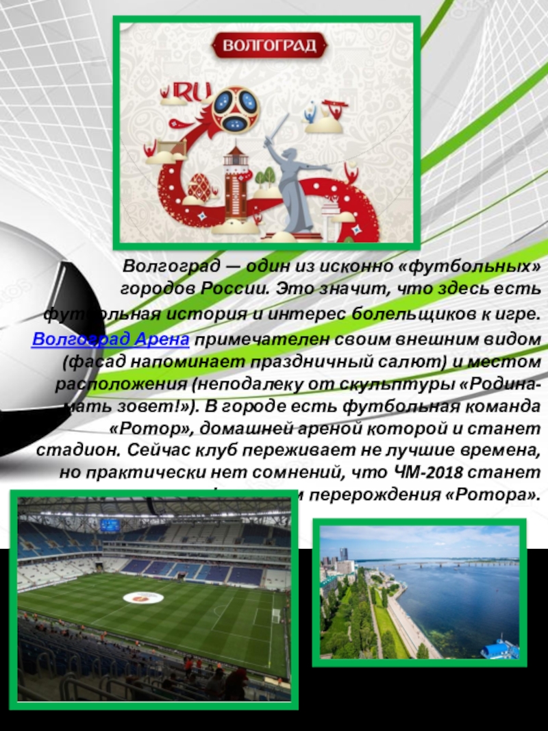 Волгоград Арена примечателен своим внешним видом (фасад напоминает праздничный салют) и местом расположения (неподалеку от скульптуры «Родина-мать зовет!»). В городе есть футбольная команда «Ротор», домашней ареной которой и станет стадион. Сейчас клуб переживает не лучшие времена, но практически нет сомнений, что ЧМ-2018 станет фактором перерождения «Ротора».