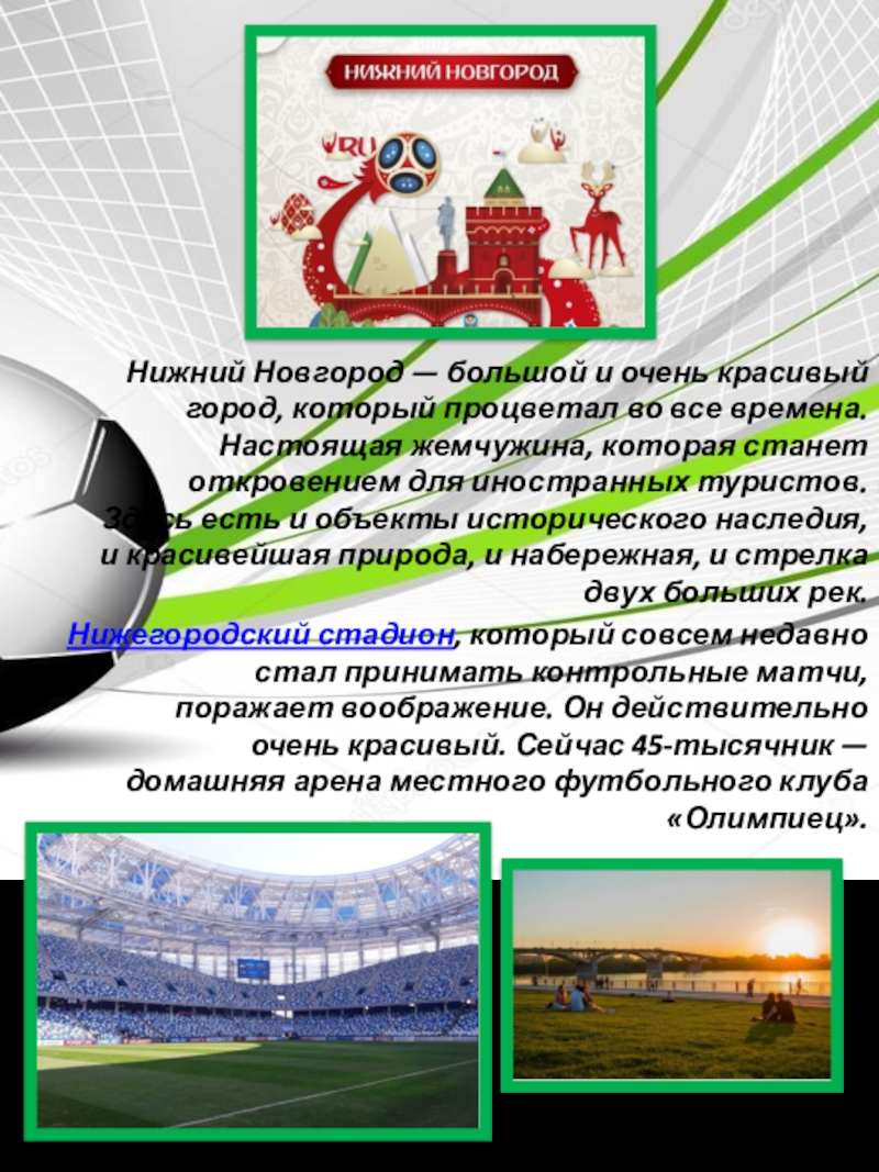 Нижегородский стадион, который совсем недавно стал принимать контрольные матчи, поражает воображение. Он действительно очень красивый. Сейчас 45-тысячник — домашняя арена местного футбольного клуба «Олимпиец».