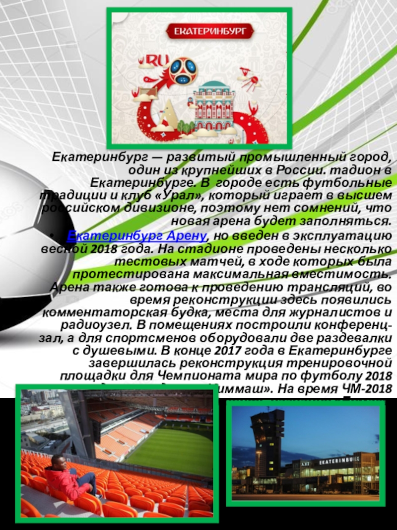 в Екатеринбурге. В городе есть футбольные традиции и клуб «Урал», который играет в высшем российском дивизионе, поэтому нет сомнений, что новая арена будет заполняться.