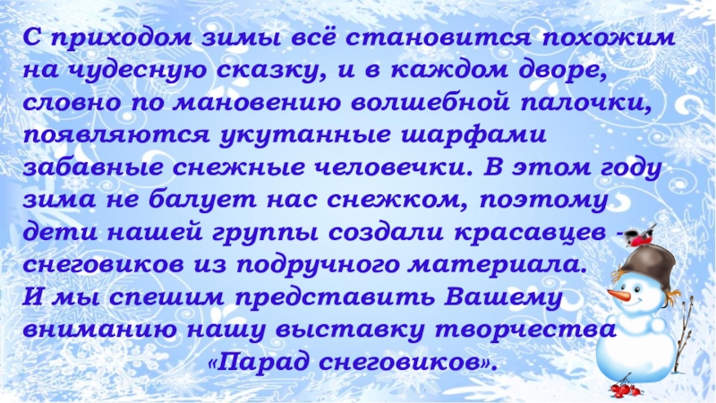 С приходом зимы всё становится похожим на чудесную сказку, и в каждом дворе, словно по мановению волшебной палочки, появляются укутанные шарфами забавные снежные человечки. В этом году зима не балует нас снежком, поэтому дети нашей группы создали