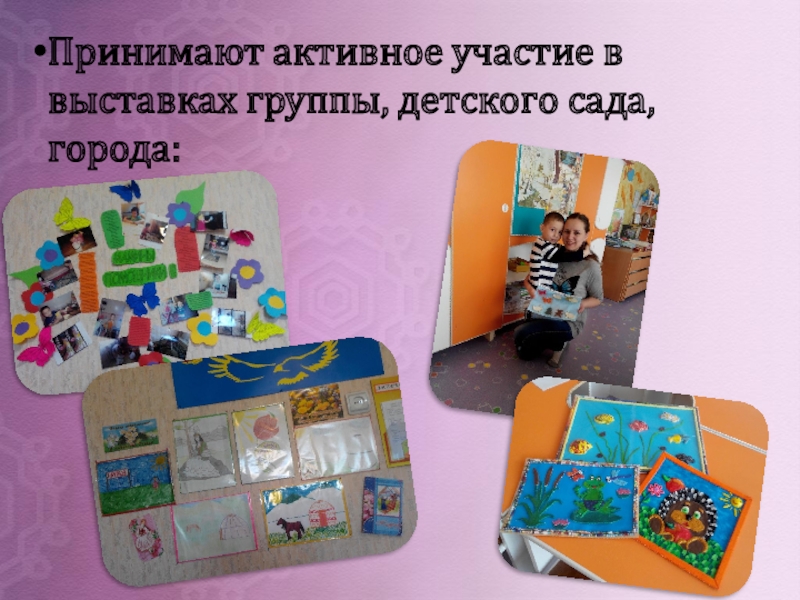Слайд 9Принимают активное участие в выставках группы, детского сада, города: