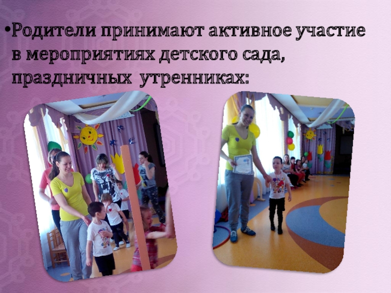 Слайд 11Родители принимают активное участие в мероприятиях детского сада, праздничных утренниках: