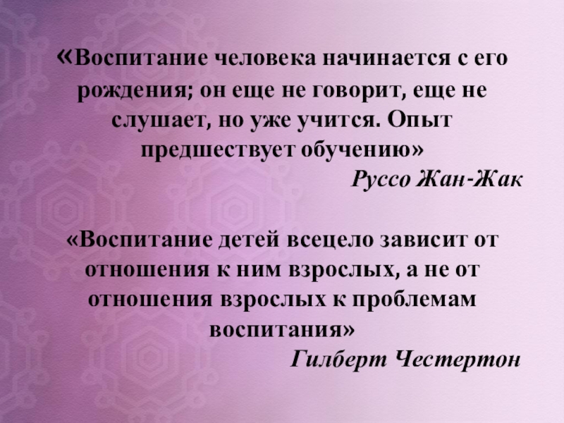 не слушает, но уже учится. Опыт предшествует обучению» Руссо Жан-Жак «Воспитание детей всецело зависит от отношения к ним взрослых, а не от отношения взрослых к проблемам воспитания» Гилберт Честертон
