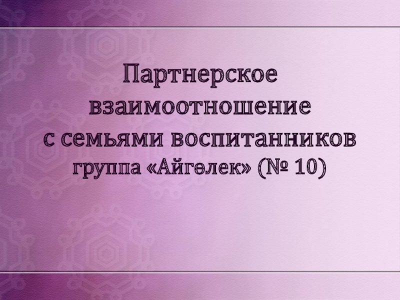Слайд 1Партнерское взаимоотношение с семьями воспитанников группа «Айгөлек» (№ 10)