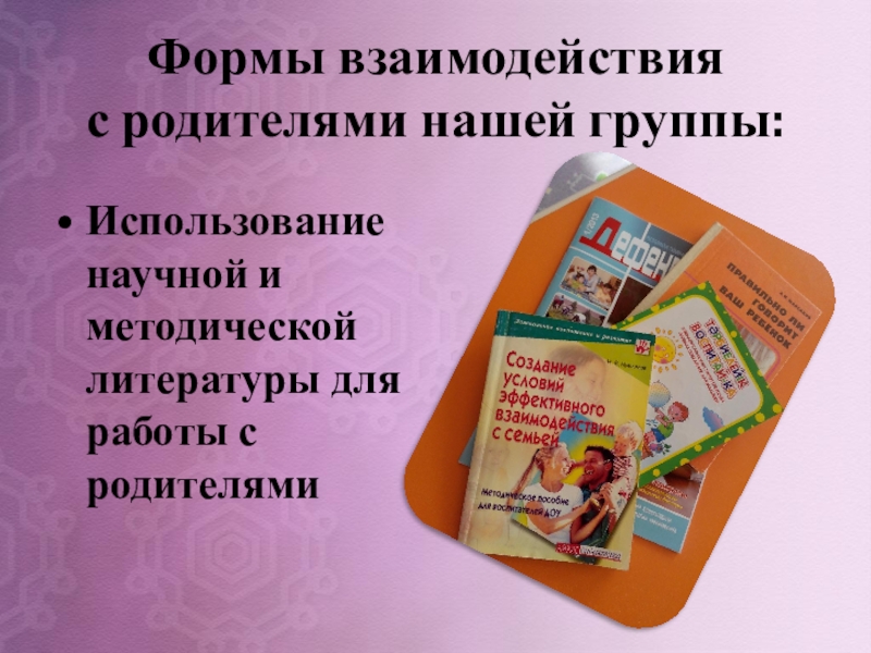 Формы взаимодействия  с родителями нашей группы: Использование научной и методической литературы для работы с родителями