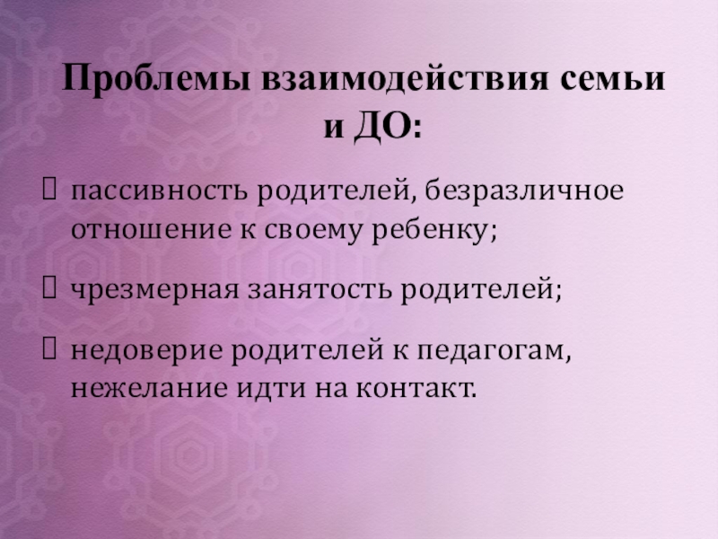 Проблемы взаимодействия семьи и ДО:пассивность родителей, безразличное отношение к своему ребенку;чрезмерная занятость родителей;недоверие родителей к педагогам,