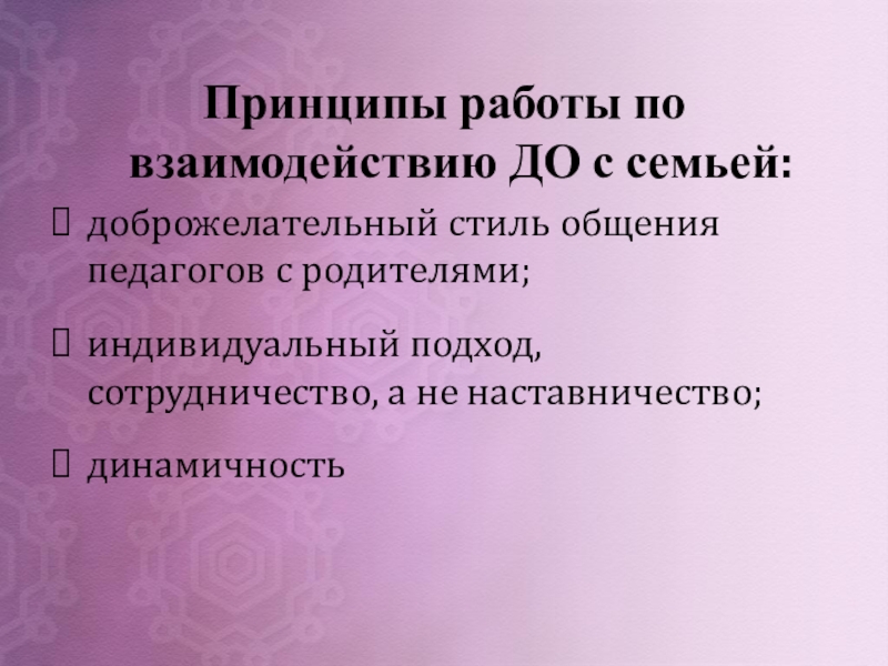 Принципы работы по взаимодействию ДО с семьей:доброжелательный стиль общения педагогов с родителями;индивидуальный подход, сотрудничество, а не наставничество;динамичность