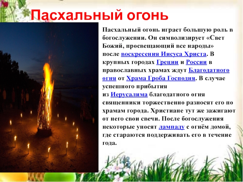 Божий, просвещающий все народы» после воскресения Иисуса Христа. В крупных городах Греции и России в православных храмах ждут Благодатного огня от Храма Гроба Господня. В случае успешного прибытия из Иерусалима благодатного огня священники торжественно разносят его по храмам города. Христиане тут же зажигают от него свои свечи. После богослужения некоторые уносят лампаду с огнём домой, где стараются поддерживать его в течение года.