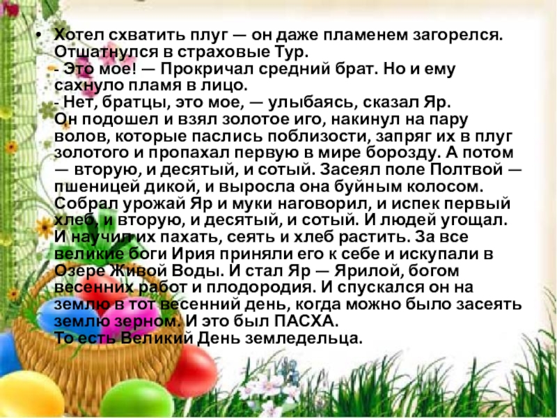 Он подошел и взял золотое иго, накинул на пару волов, которые паслись поблизости, запряг их в плуг золотого и пропахал первую в мире борозду. А потом — вторую, и десятый, и сотый. Засеял поле Полтвой — пшеницей дикой, и выросла она буйным колосом. Собрал урожай Яр и муки наговорил, и испек первый хлеб, и вторую, и десятый, и сотый. И людей угощал. И научил их пахать, сеять и хлеб растить. За все великие боги Ирия приняли его к себе и искупали в Озере Живой Воды. И стал Яр — Ярилой, богом весенних работ и плодородия. И спускался он на землю в тот весенний день, когда можно было засеять землю зерном. И это был ПАСХА.