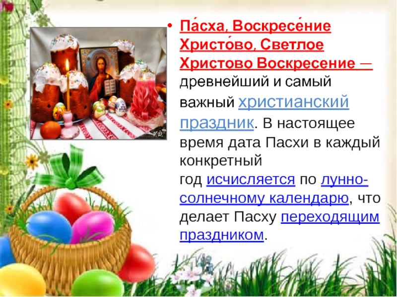 Слайд 4Па́сха, Воскресе́ние Христо́во, Светлое Христово Воскресение —древнейший и самый важный христианский праздник. В настоящее время