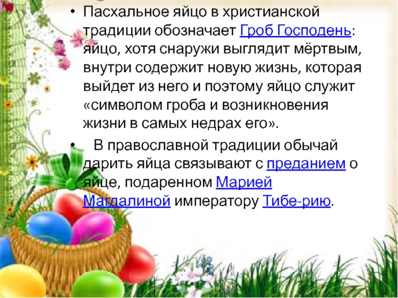 В православной традиции обычай дарить яйца связывают с преданием о яйце, подаренном Марией Магдалиной императору Тибе-рию.