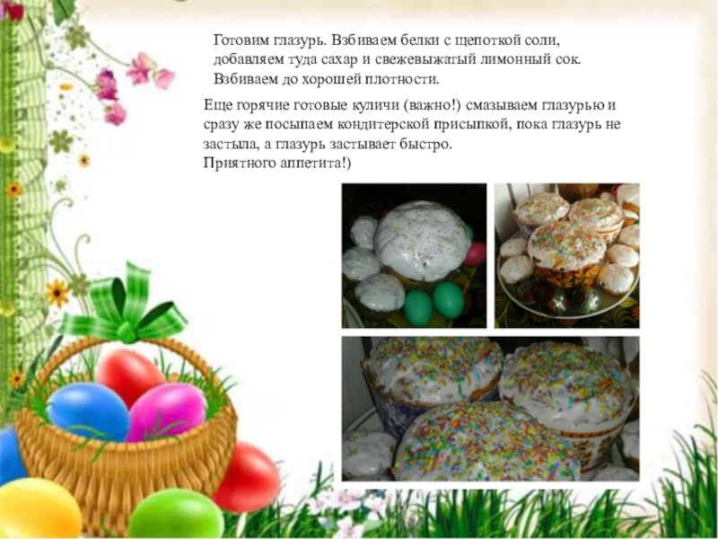 Еще горячие готовые куличи (важно!) смазываем глазурью и сразу же посыпаем кондитерской присыпкой, пока глазурь не застыла, а глазурь застывает быстро.
