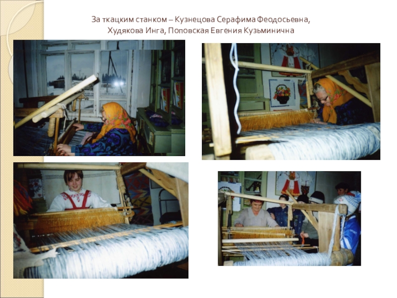 Слайд 20За ткацким станком – Кузнецова Серафима Феодосьевна, Худякова Инга, Поповская Евгения