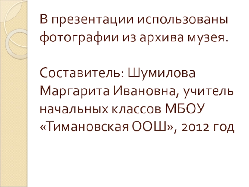 В презентации использованы фотографии из архива музея.  Составитель: Шумилова Маргарита Ивановна, учитель начальных классов МБОУ «Тимановская