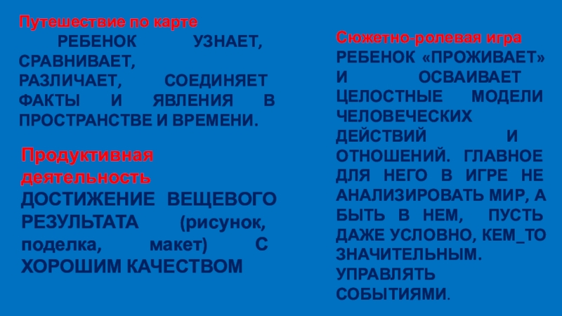 РЕБЕНОК «ПРОЖИВАЕТ» И ОСВАИВАЕТ ЦЕЛОСТНЫЕ МОДЕЛИ ЧЕЛОВЕЧЕСКИХ ДЕЙСТВИЙ И ОТНОШЕНИЙ. ГЛАВНОЕ ДЛЯ НЕГО В ИГРЕ НЕ АНАЛИЗИРОВАТЬ МИР, А БЫТЬ В НЕМ, ПУСТЬ ДАЖЕ УСЛОВНО, КЕМ_ТО ЗНАЧИТЕЛЬНЫМ. УПРАВЛЯТЬ СОБЫТИЯМИ.