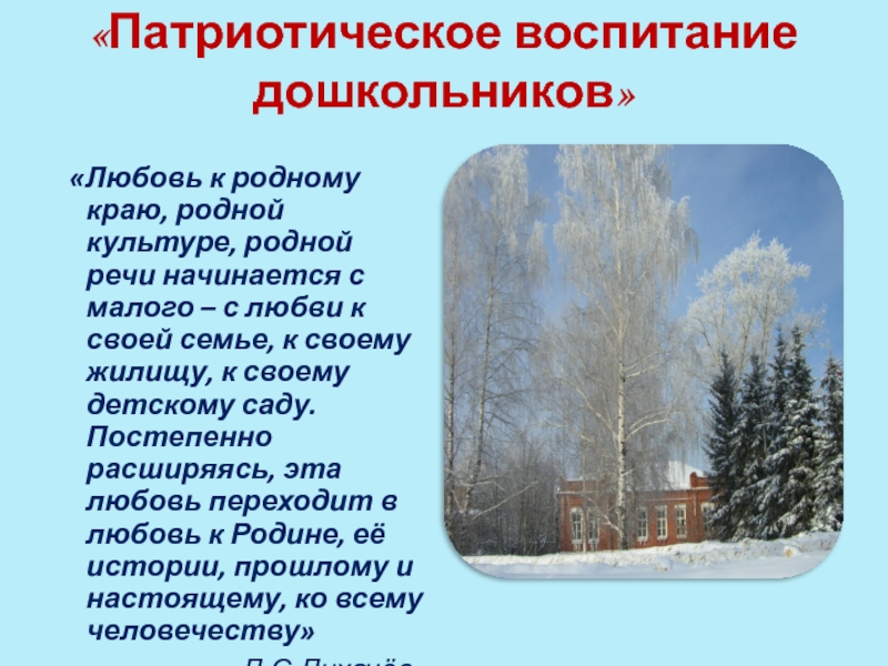 начинается с малого – с любви к своей семье, к своему жилищу, к своему детскому саду. Постепенно расширяясь, эта любовь переходит в любовь к Родине, её истории, прошлому и настоящему, ко всему человечеству»