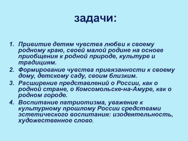 Обосновать пути и средства патриотического воспитания дошкольников в семье, на занятиях и в повседневной жизни.