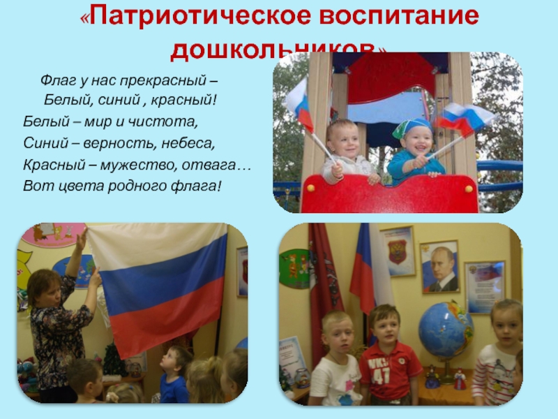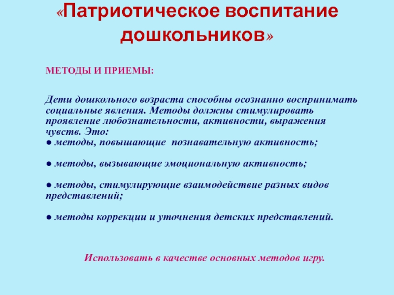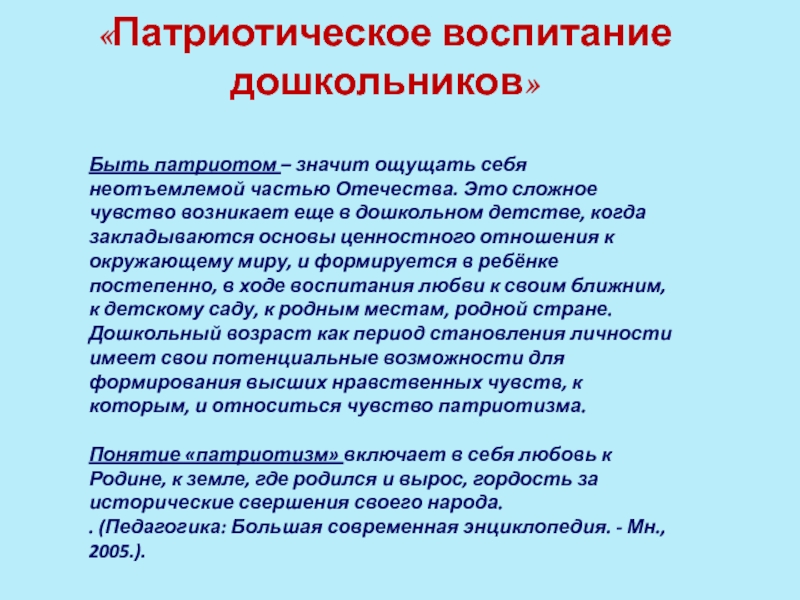 Это сложное чувство возникает еще в дошкольном детстве, когда закладываются основы ценностного отношения к окружающему миру, и формируется в ребёнке постепенно, в ходе воспитания любви к своим ближним, к детскому саду, к родным местам, родной стране. Дошкольный возраст как период становления личности имеет свои потенциальные возможности для формирования высших нравственных чувств, к которым, и относиться чувство патриотизма.