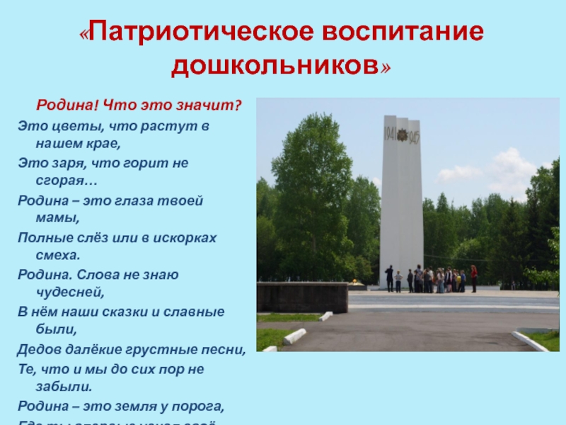 Желание беречь и приумножать исторические и природные богатства - вот цель воспитания любви к Родине, воспитание патриотов своего Отечества.