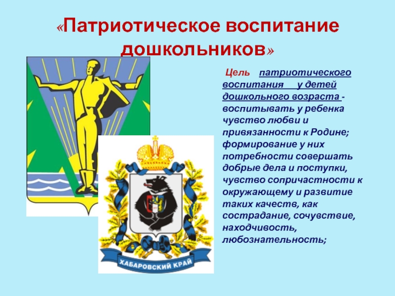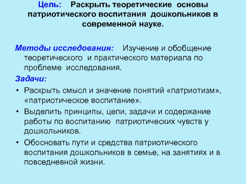 Слайд 4Цель: Раскрыть теоретические основы патриотического воспитания дошкольников в современной науке.