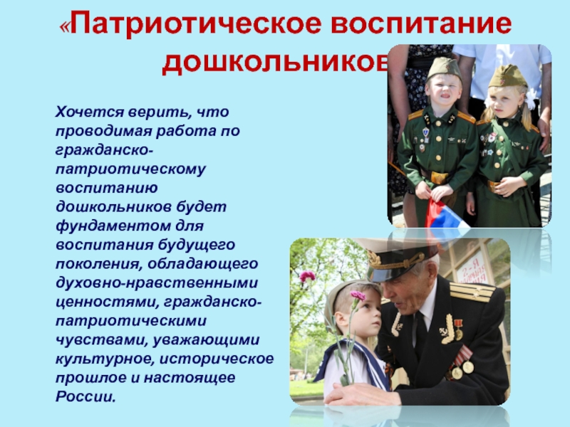 гражданско-патриотическому воспитанию дошкольников будет фундаментом для воспитания будущего поколения, обладающего духовно-нравственными ценностями, гражданско-патриотическими чувствами, уважающими культурное, историческое прошлое и настоящее России.