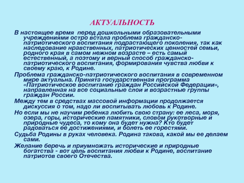Проблема гражданско-патриотического воспитания в современном мире актуальна. Принята государственная программа «Патриотическое воспитание граждан Российской Федерации», направленная на все социальные слои и возрастные группы граждан России.