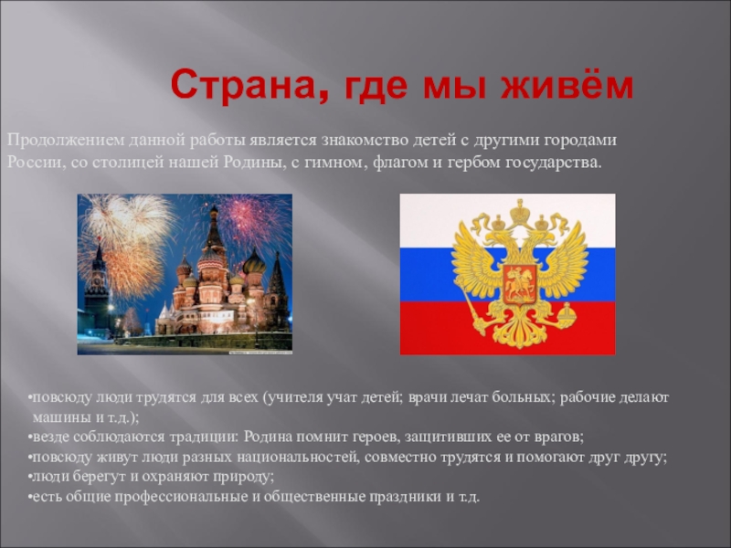 повсюду люди трудятся для всех (учителя учат детей; врачи лечат больных; рабочие делают машины и т.д.);