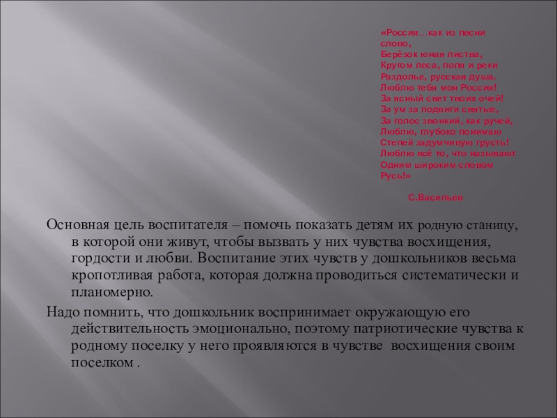 Основная цель воспитателя – помочь показать детям их родную станицу, в которой они живут, чтобы вызвать у них чувства восхищения, гордости и любви. Воспитание этих чувств у дошкольников весьма кропотливая работа, которая должна проводиться систематически и планомерно.