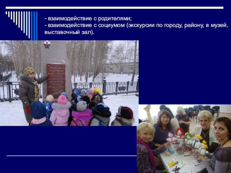 знакомство с семьёй, ее историей, родственниками, семейными традициям, составление родословной; с детским садом его ребятами, взрослыми, играми, игрушками, традициями; с городом, селом, его историей, гербом, традициями, выдающимися горожанами, селянами прошлого и настоящего времени, достопримечательностями;