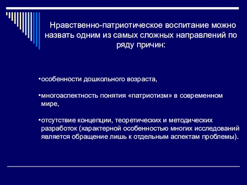Слайд 5Нравственно-патриотическое воспитание можно назвать одним из самых сложных направлений по ряду