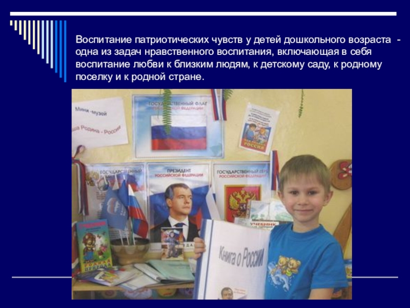 нравственного воспитания, включающая в себя воспитание любви к близким людям, к детскому саду, к родному поселку и к родной стране.