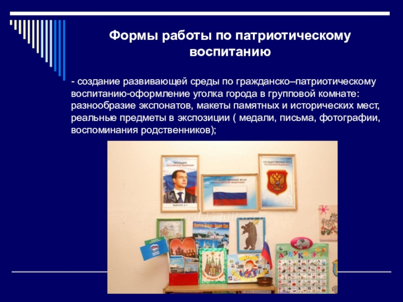 - создание развивающей среды по гражданско–патриотическому воспитанию-оформление