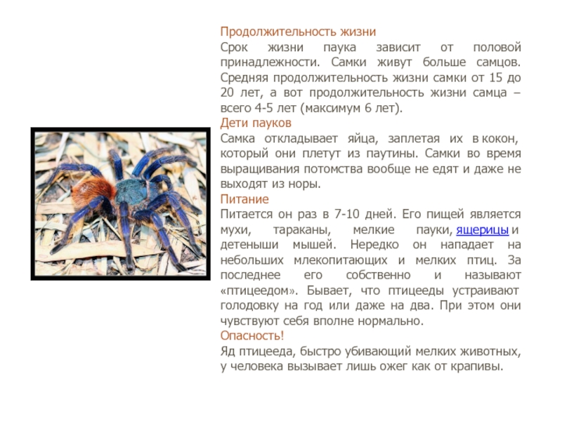 Яд птицееда, быстро убивающий мелких животных, у человека вызывает лишь ожег как от крапивы.