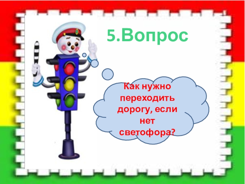 Как нужно переходить дорогу, если нет светофора?5.Вопрос