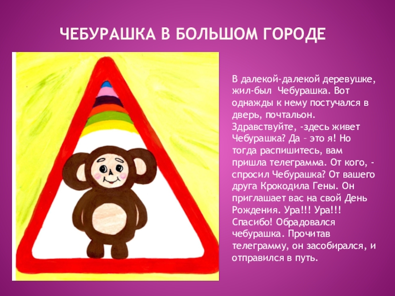 Наконец, Чебурашка добрался до своего друга Крокодила Гены. Чебурашка поздравил своего друга Гену, и подарил подарок Книгу о Правилах Дорожного Движения, и рассказал историю, которая приключилась с ним……