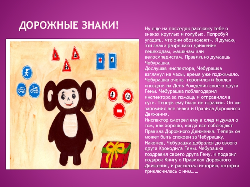 Дослушав инспектора, Чебурашка взглянул на часы, время уже поджимало. Чебурашка очень торопился и боялся опоздать на День Рождения своего друга Гены. Чебурашка поблагодарил инспектора за помощь и отправился в путь. Теперь ему было не страшно. Он же запомнил все знаки и Правила Дорожного Движения.