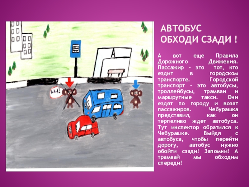 это тот, кто ездит в городском транспорте. Городской транспорт – это автобусы, троллейбусы, трамваи и маршрутные такси. Они ездят по городу и возят пассажиров. Чебурашка представил, как он терпеливо ждет автобуса. Тут инспектор обратился к Чебурашке. Выйдя с автобуса, чтобы перейти дорогу, автобус нужно обойти сзади! Запомни! А трамвай мы обходим спереди!