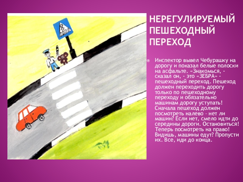 на асфальте. «Знакомься, - сказал он, - это «ЗЕБРА» - пешеходный переход. Пешеход должен переходить дорогу только по пешеходному переходу и обязательно машинам дорогу уступать! Сначала пешеход должен посмотреть налево – нет ли машин? Если нет, смело идти до середины дороги. Остановиться! Теперь посмотреть на право! Видишь, машины едут? Пропусти их. Все, иди до конца.