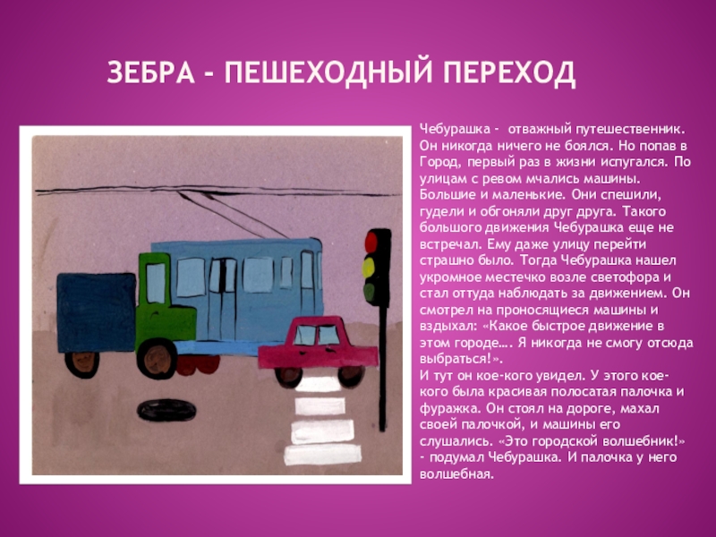 И тут он кое-кого увидел. У этого кое-кого была красивая полосатая палочка и фуражка. Он стоял на дороге, махал своей палочкой, и машины его слушались. «Это городской волшебник!» - подумал Чебурашка. И палочка у него волшебная.