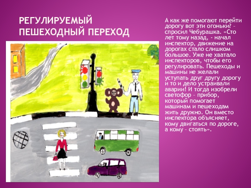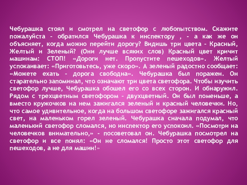 – спросил Чебурашка. «Сто лет тому назад, - начал инспектор, движение на дорогах стало слишком большое. Уже не хватало инспекторов, чтобы его регулировать. Пешеходы и машины не желали уступать друг другу дорогу и то и дело устраивали аварии! И тогда изобрели светофор – прибор, который помогает машинам и пешеходам жить дружно. Он вместо инспектора объясняет, кому двигаться по дороге, а кому – стоять».