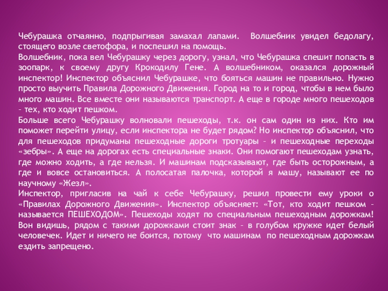 Волшебник, пока вел Чебурашку через дорогу, узнал, что Чебурашка спешит попасть в зоопарк, к своему другу Крокодилу Гене. А волшебником, оказался дорожный инспектор! Инспектор объяснил Чебурашке, что бояться машин не правильно. Нужно просто выучить Правила Дорожного Движения. Город на то и город, чтобы в нем было много машин. Все вместе они называются транспорт. А еще в городе много пешеходов – тех, кто ходит пешком.