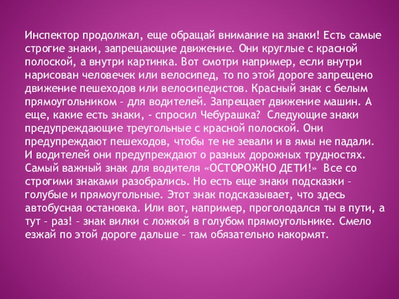 Слайд 10Инспектор продолжал, еще обращай внимание на знаки! Есть самые строгие знаки,