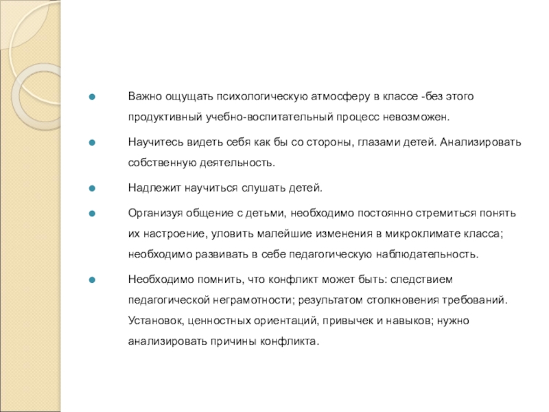 Организуя общение с детьми, необходимо постоянно стремиться понять их настроение, уловить малейшие изменения в микроклимате класса; необходимо развивать в себе педагогическую наблюдательность.