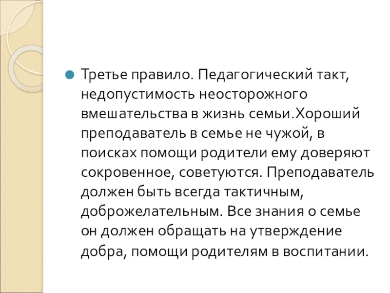 Третье правило. Педагогический такт, недопустимость неосторожного вмешательства в жизнь семьи.Хороший преподаватель