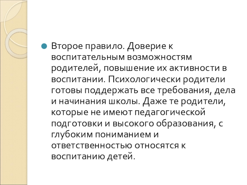 Второе правило. Доверие к воспитательным возможностям родителей, повышение их активности в