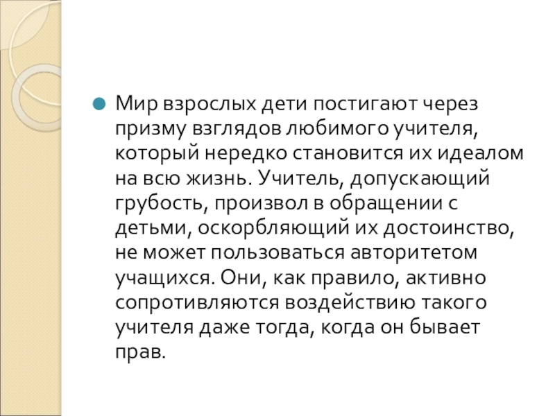становится их идеалом на всю жизнь. Учитель, допускающий грубость, произвол в обращении с детьми, оскорбляющий их достоинство, не может пользоваться авторитетом учащихся. Они, как правило, активно сопротивляются воздействию такого учителя даже тогда, когда он бывает прав.