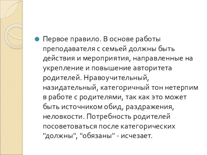 Первое правило. В основе работы преподавателя с семьей должны быть действия