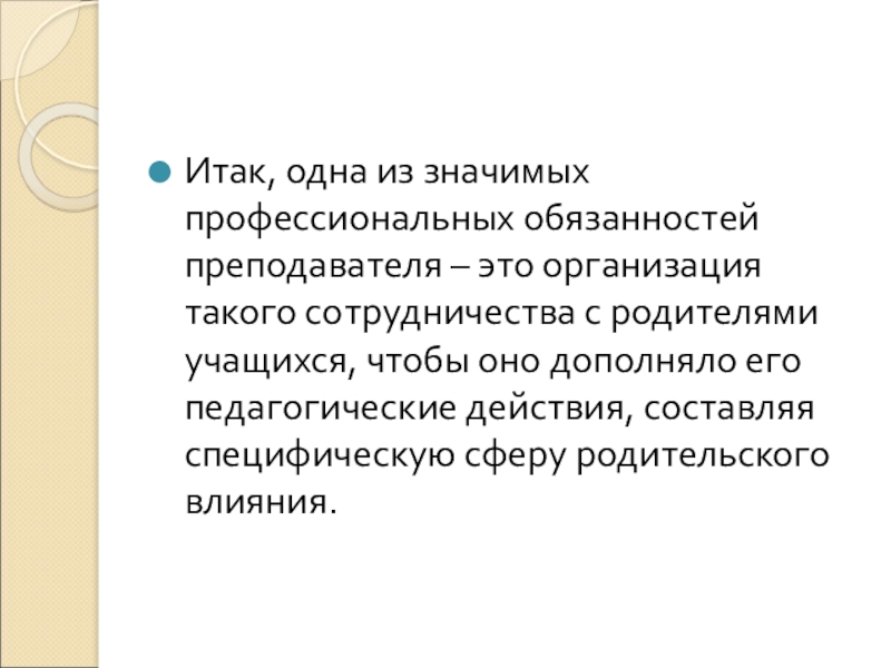 сотрудничества с родителями учащихся, чтобы оно дополняло его педагогические действия, составляя специфическую сферу родительского влияния.